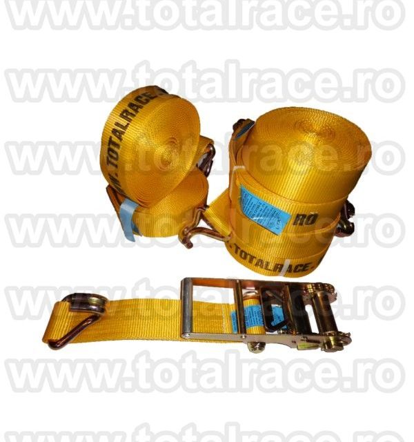 Total Race comercializeaza cu livrare rapida din stoc chingi de ancorare sistem 75 mm cu latime banda 75 mm lungime totala chinga ancorare 12 metri, in conformitate cu EN 12195 – 2 , elongatie < 7 % cu clichet Stf 500 daN, din 2 parti , carlige diverse modele ; din poliester, culoare galbena. Capacitatea de ancorare este Lc 5000 daN drept si Lc 10000 daN peste incarcatura, eticheta ancorare – date de identificare produs , chingi fixare marfa 10 tone. Chingile textile de ancorare 10 tone sunt insotite de Declaratie de Conformitate. Se utilizeaza pentru legarea, ancorarea si protejarea marfurilor in timpul transportului, sunt chingi usor de folosit si nu deterioreaza marfa.