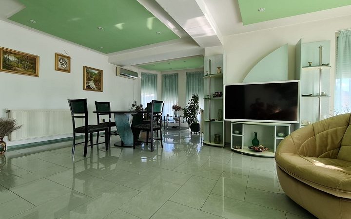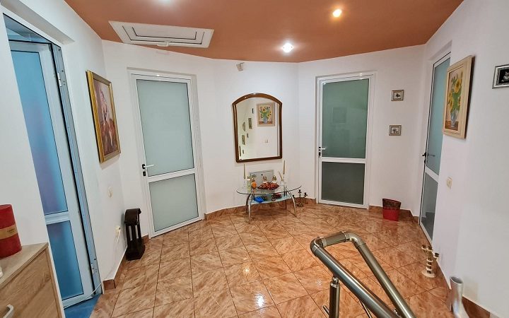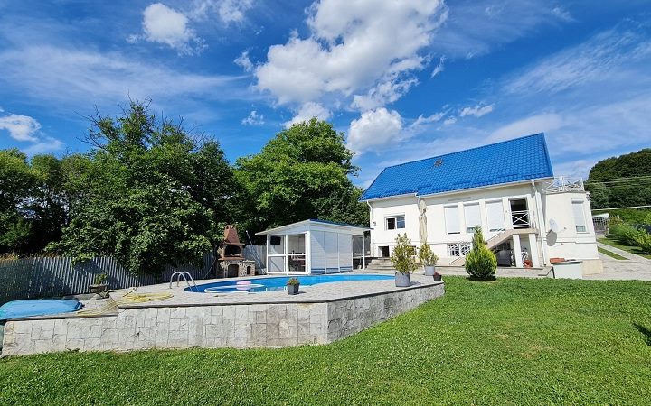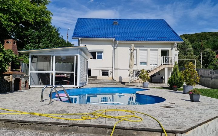 Vila cu 3 dormitoare, hol, bucatarie, birou, 2 bai, living room+dining, cu teren – 881 mp , piscina cu utilitati -( apa, canal, gaz cu centrala termică), existând 4 locuri de parcare in fata casei.